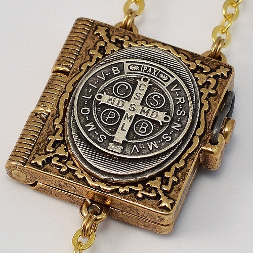 St. Benedict Rosary Made in Italy Antique Gold Plated Finish 8x6 mm Cordovan Color Wood Beads Benedictine Gold Plate Crucifix with Brown Enamel Inlay Corpus and St. Benedict Medal in Antique Silver Plate Centerpiece is Medal of St Benedict w/ Gold Plated Booklet Inside Booklet is St Benedict's Prayer in Latin St. Benedict Medals Represent Our Father Beads Gift Boxed Perfect Gift for Confirmation, First Communion, RCIA, Father's Day or any occasion!! This beautiful Rosary makes a lovely keepsake!