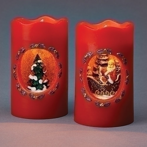 This 2 piece LED candle set makes a festive addition to your Christmas home decor. One candle features a scene with Santa in his sleigh. The second candle features a snow capped Christmas Tree with cardinals resting on the branches. Both scenes are illuminated by the LED light. Candles require AA batteries (not included) Candles are 5"H and made of wax and pvc. MSRP $37.00 You save $11.00