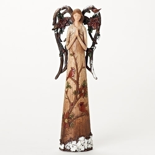 This sweet, winter angel is embellished with red cardinals, poinsettias and winter foliage. The figurine gives the appearance of being carved from wood. The wings appear to be made of tree branches. Her hands are folded in prayer as she watches over your home. Makes a lovely decorative item for your holiday home or to give as a gift. Boxed . 14.5"H. Stone/Resin
