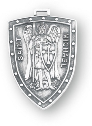 Saint Michael the Archangel sterling silver medal made in the USA by skilled New England Silversmiths. The 1-1/4" shield shaped medal depicts St. Michael defeating the devil in battle. Using only the finest grade sterling silver enables the intricate details of the coined fine silver to fully show when the antique finish is applied to each medal by hand polishing. Hand engraving is expertly furnished to the medal to display the magnificent sheen of pure sterling. Supplied with an 18" genuine rhodium plated chain in a deluxe gift box.