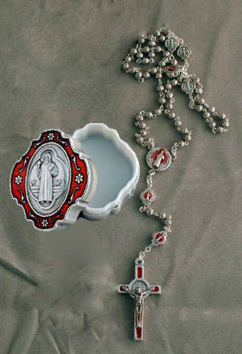 A St. Benedict Rosary, silver tone with red enamel, 14" L. Comes with an ornate, matching red enamel metal box. Made in Italy. Makes a lovely keepsake gift for Confirmation, RCIA, First Communion or any occasion. (MSRP $43.00)