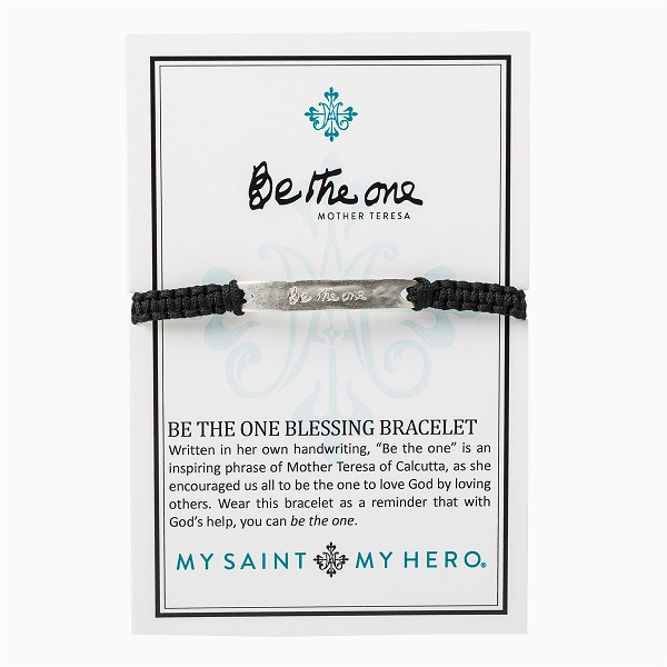 BE THE ONE Written in her own handwriting, Be the one is an inspiring phrase of Mother Teresa of Calcutta, as she encouraged us all to be the one to love God by loving others. Wear this bracelet as a reminder that with God's help, you can be the one. For Men and Women - adjustable cording which opens to 9.5" diameter. Handwoven in Medjugorje, Bosnia and Herzegovina. Silver tone or gold tone hammered zinc bar engraved with the words Be the one, and our signature "blessed" tag. Medals made in Italy. Please do not try to bend the bar to shape to your wrist. On an inspirational card.