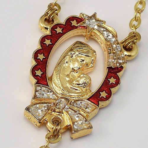 Exquisite Christmas Rosary by Ghirelli! 8mm Bohemian Glass Beads give an antique effect. The Our Father Beads are 8 mm glass with a festive red, pink and green floral pattern and gold plated caps. The Centerpiece features the Virgin Mary maternally embracing Jesus. The image is framed with Christmas symbols of gold stars with a sparkle Star of Bethlehem at the top, all against a field of red enamel. At the base of the frame is a sparkle bow. The beautiful Baroque Style Crucifix has a gold plated finish and red, hand enameled inserts. Comes Gift Boxed. Made in Italy. Makes a wonderful Keepsake Gift!!