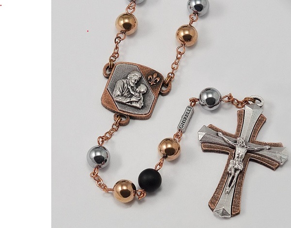 The perfect rosary beads for men! Saint Joseph is featured in this incredibly original rosary design. Exceptional quality -- strong, durable components in two-tone finish. Beads: Hematite semi-precious natural stone beads, in alternating positions, in 8 mm size and silver and copper/gold color finishes. With semi-precious natural stone Agate accent beads in 8 mm size and black color satin finish Crucifix: Unique and original design characterized by the overlap of two separate elements in two contrasting finishes – antique silver and antique copper Centerpiece: A creation inspired by the greatness of Saint Joseph. Composed of two separate components in two contrasting finishes – antique silver and antique copper --with textured crosshatch surfaces Finishing: Antique Copper components in antique copper and antique silver two-tone finishes