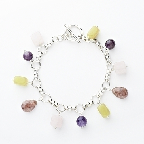 Beautiful, Sterling Silver Bracelet with Multi Color, Faceted Gemstones by Alexa's Angels. The faceted gemstones are round-purple, rectangle-green, square- light pink, pear- rosey brown. Toggle Closure. 7" Long. Perfect for year round wear! Makes a great gift for any occasion. (MSRP 41.00)