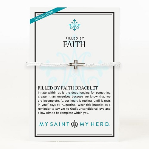 FILLED BY FAITH Innate within us is the deep longing for something greater than ourselves because we know that we are incomplete. “...our heart is restless until it rests in you,” says St. Augustine. Wear this bracelet as a reminder to say yes to God’s unconditional love and allow Him to be complete within you. Adjustable string which opens to 9.5" diameter Handwoven in Medjugorje, Bosnia and Herzegovina Metallic Silver cord with Silver-tone cross and our logo charm Medals made in Italy On an inspirational card Perfect for Easter Basket, Christmas Stocking, Confirmation, Mother's Day, Birthday, Graduation,or any occasion!
