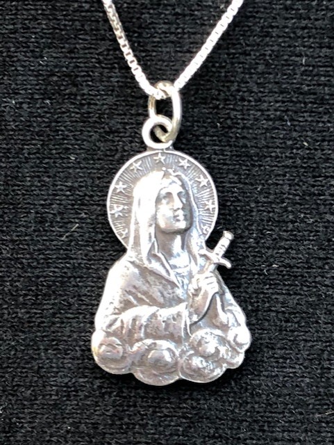 Our Lady of Sorrows Sterling Silver Medal 1"H Beautifully detailed image of the sword piercing her Immaculate Heart Re- Cast from a vintage medal Very Unique 24" Sterling Silver box chain is included23