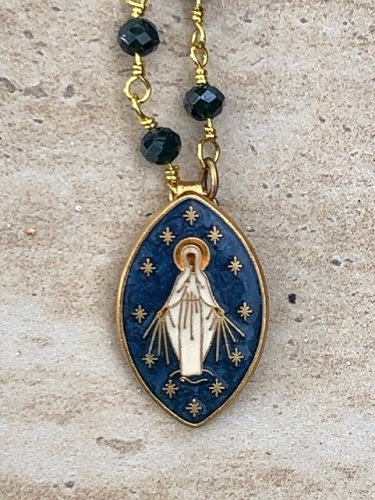This unique, blue, hand- enameled Miraculous Medal of the Blessed Mother, is handmade in a monastery in Lourdes, France. Crafted by the nuns who hand pour the enamel, these medals are exquisite and a real treasure. Beautiful polished brass with blue enamel, these medals not only have significance as a sacramental but are also lovely to wear. This medal is 1" and is paired with a 25" matching beaded chain. The backside has the markings of the Miraculous Medal along with the prayer, "O Mary conceived without sin, pray for us who have recourse to thee." ( in French) Because of the delicate nature of the enamel, water or chemicals should not be used on it. A soft polishing cloth is best. Be sure to get it blessed by a priest so you don't miss out on the graces you may receive for wearing it with devotion. This makes a beautiful and welcome gift for any Holiday, Confirmation, RCIA, Get Well, New Mom, Mother's Day or any occasion