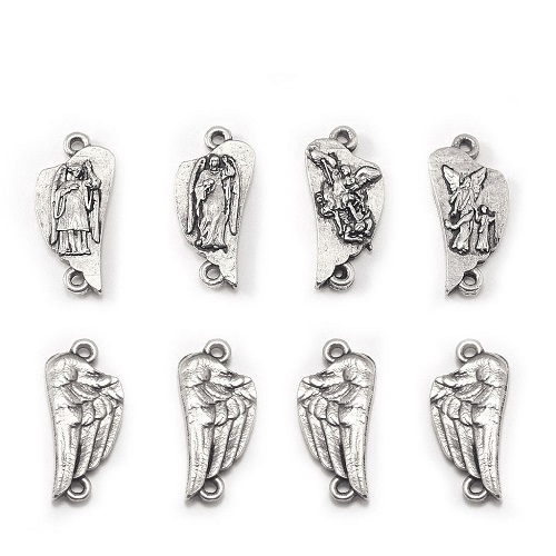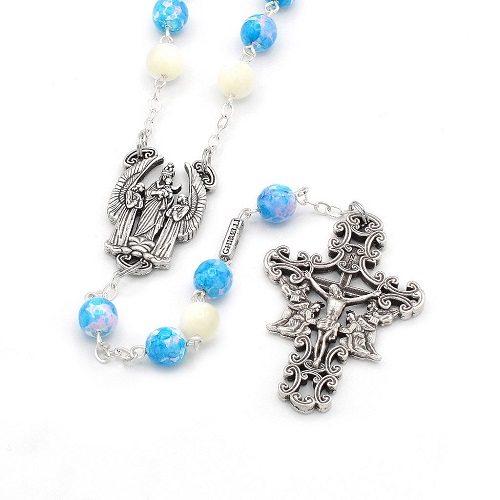 Beautiful, original, highly detailed and inspirational rosary made in Italy exclusively by Ghirelli. The ornate Crucifix features Our Lord Jesus with two holy angels by his side, the Centerpiece showing Our Lady holding the Christ Child with two holy angels on either side, and four detailed Our Father/Pater medals featuring images of Saint Gabriel, Saint Raphael, Saint Michael, and the Guardian Angels, with identifying text on the reverse side of each medal. Available in Antique Silver Finish, with Blue Swirl Bohemian Glass Beads in 8mm size, and Genuine Mother Of Pearl white color Beads in 8mm size.
