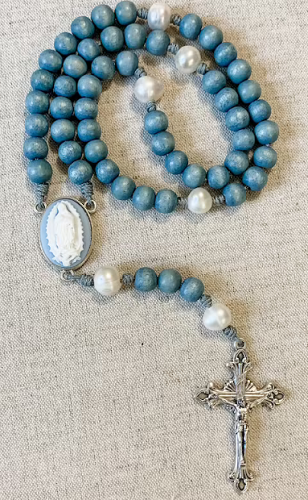 Beautiful Catholic Rosary features a Blue and White Cameo " Our Lady of Guadalupe" Centerpiece, Blue Wood 'Hail Mary" Beads and White Natural Pearl "Our Father" Beads. A Sturdy Micro Cord makes the Rosary not only beautiful, but long lasting and durable. Handmade in the USA. Crucifix is 2 inches. This makes a lovely, inspirational gift for an Expectant or New Mom, Mother's Day, Confirmation, Pro-Life, Birthday, Holidays or any occasion.