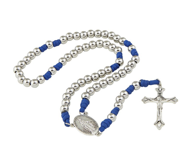 Mary, also known as St. Mary the Virgin, the Blessed Virgin Mary, Saint Mary, Mary Mother of God or the Virgin Mary is believed by many to be the greatest of all Christian saints. The Virgin Mother "was, after her Son, exalted by divine grace above all angels and men. This paracord rosary features an extra durable design that will stand test of time. Suitable for gifting as well as personal use, this rosary is sure to become your favorite. Blessed Mother Paracord Rosary Blue paracord with Miraculous center and traditional crucifix Material: Stainless Steel/Cord Size: 8 mm Bead, 14-/2" L, 1-7/8" Crucifix