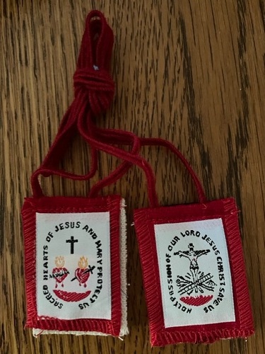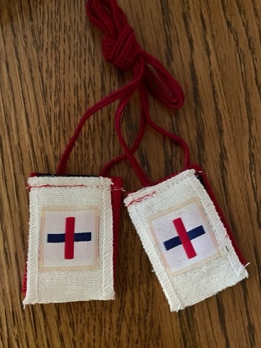 The Five Fold scapular includes five scapulars in one. The red Passion Scapular, The brown Mt. Caramel Scapular, the black Seven Dolors scapular, the Blue Immaculate Conception scapular, and the white Trinity scapular. A paper booklet with information about the scapulars is included. Scapular is made of 100% wool.