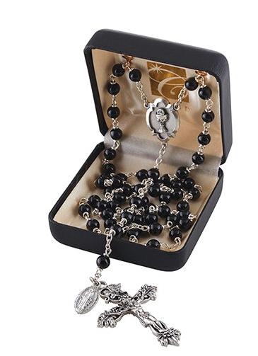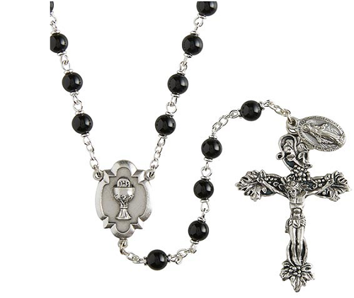 Featuring the all new Grapevine Crucifix, this beautifully designed First Communion Rosary comes with a Chalice Medal Centerpiece, 6MM Black Glass Beads and Loc Link construction for durability. Arrives in an elegant, leatherette, gift box.