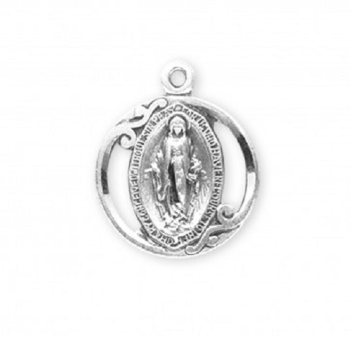 Details Blessed Mother Mary with rays coming out of her extended hands, crushing a serpent under her feet. Round shaped double sided pendant set inside a fancy pierced circle. Solid .925 sterling silver. Medal is die struck. Hand polished and engraved by New England Silversmiths. Dimensions: 0.7" x 0.6" (17mm x 14mm) Weight of medal: 1.5 Grams. 18" Genuine rhodium plated curb chain. Made in USA. Deluxe velvet gift box. **Sterling Silver Chain available for additional cost, upon request