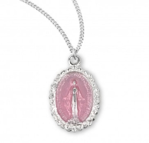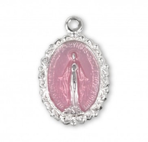 Details Blessed Mother Mary with rays coming out of her extended hands, crushing a serpent under her feet. Pink enameled oval shaped double sided pendant. Solid .925 sterling silver. Medal is die struck. Hand polished and engraved by New England Silversmiths. Dimensions: 0.7" x 0.4" (17mm x 11mm) Weight of medal: 1.6 Grams. 13" Genuine rhodium plated curb chain. Made in USA. Deluxe velvet gift box. Sterling Silver Chain available for additional cost, upon request