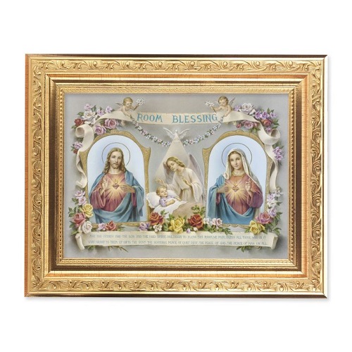 This beautiful Gold-Leaf Frame with decorative design displays our fine quality lithograph of Baby Room Blessing, under glass, with velvet easel backing. This sweet image pictures a baby with the Sacred Heart of Jesus and the Immaculate Heart of Mary. It makes he perfect keepsake gift for New Baby, Baptism, Baby Shower, or Baby's Birth. Gold-Leaf Antique Finished Frame with Acanthus-Leaf Detail 6" x 8" Baby Room Blessing SHJ-IHM Print under glass Frame size is 8-1/4" x 10-1/4" Frame width is 1-1/4" Velvet Easel Back Artwork Printed in Italy Assembled in the USA Comes Boxed