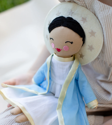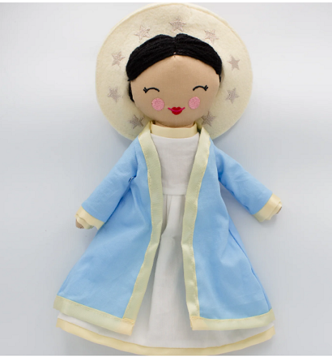 Our Lady of La Vang appeared in Vietnam around 1800 when Catholics were being persecuted. While hiding in the jungle, the people would gather to pray the rosary nightly at the same tree. Many of them had also fallen ill from the harsh conditions. One night during their prayers, Mary appeared dressed in the traditional Vietnamese dress, holding baby Jesus, with an angel on ether side. Mary comforted them, and gave them instructions on how to make medicine from the trees to cure their illness. She is clothed in a white dress with pale gold satin trim, an adorable blue overcoat with pale gold satin trim (the overcoat is removable), and a beautiful felt headpiece with a halo of embroidered stars. Mary's hair is pulled back into a lovely bun. Each doll is hand-sewn and finished with lovely embroidery. Doll is 12” tall. Cotton and satin trim, all new polyester fill.